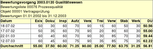 Die vorstehende Abbildung zeigt die Werte für den Bewertungsvorgang "Qualitätswesen" mit der Bewertungsliste Prozessqualität.